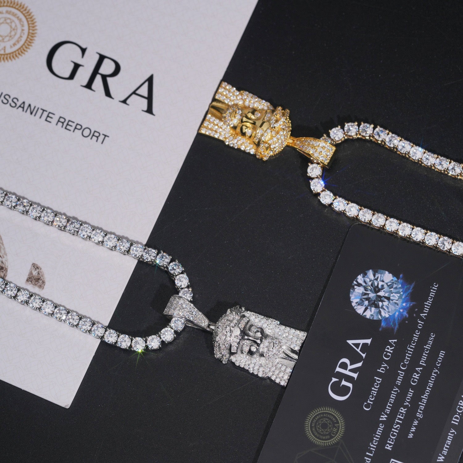 The YORI 1.65” Jesus Pendant is crafted from solid 925 sterling silver and set with VVS D-colour moissanite stones, forming a detailed Jesus figure with exceptional brilliance and depth. Each stone is precision-set to ensure secure placement, refined detailing, and consistent light performance across the entire pendant. Finished with a white or yellow gold plating.