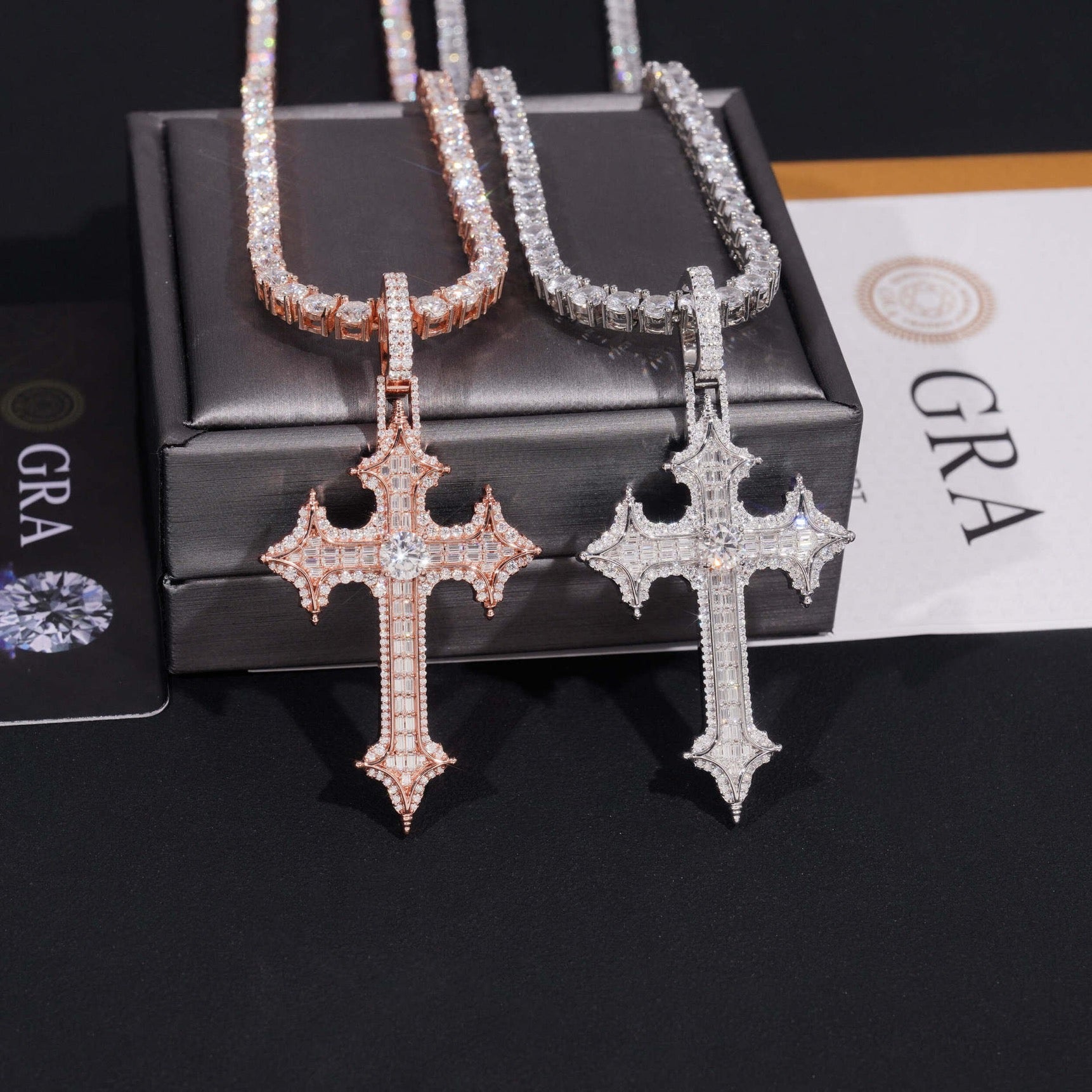 The YORI 2.5” Baguette Pavé Gothic Cross Pendant is crafted from solid 925 sterling silver, set with round brilliant-cut and baguette-cut VVS D‑colour moissanite stones. Each stone is hand‑set with precision to ensure secure placement, clean symmetry, and consistent light performance across the entire piece.