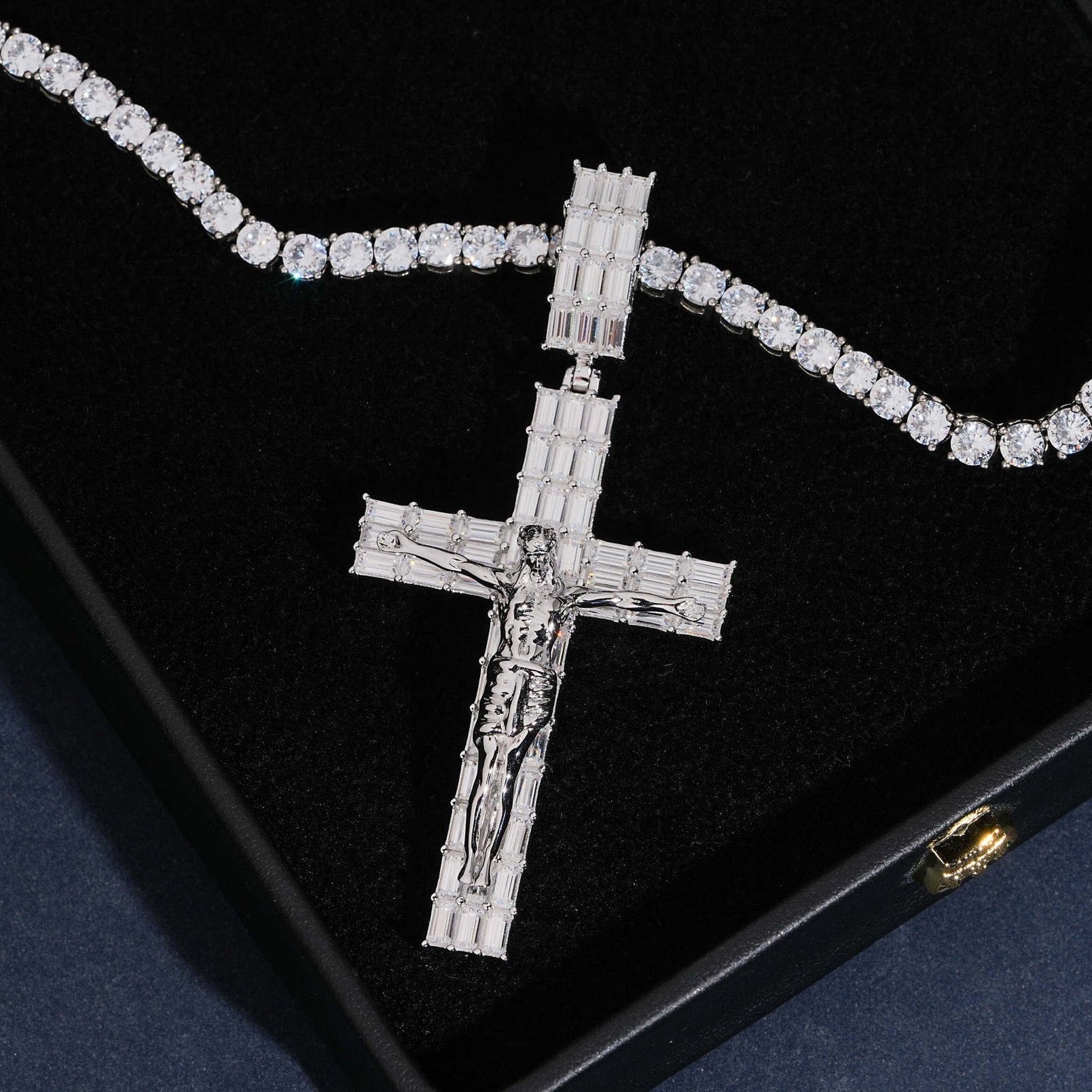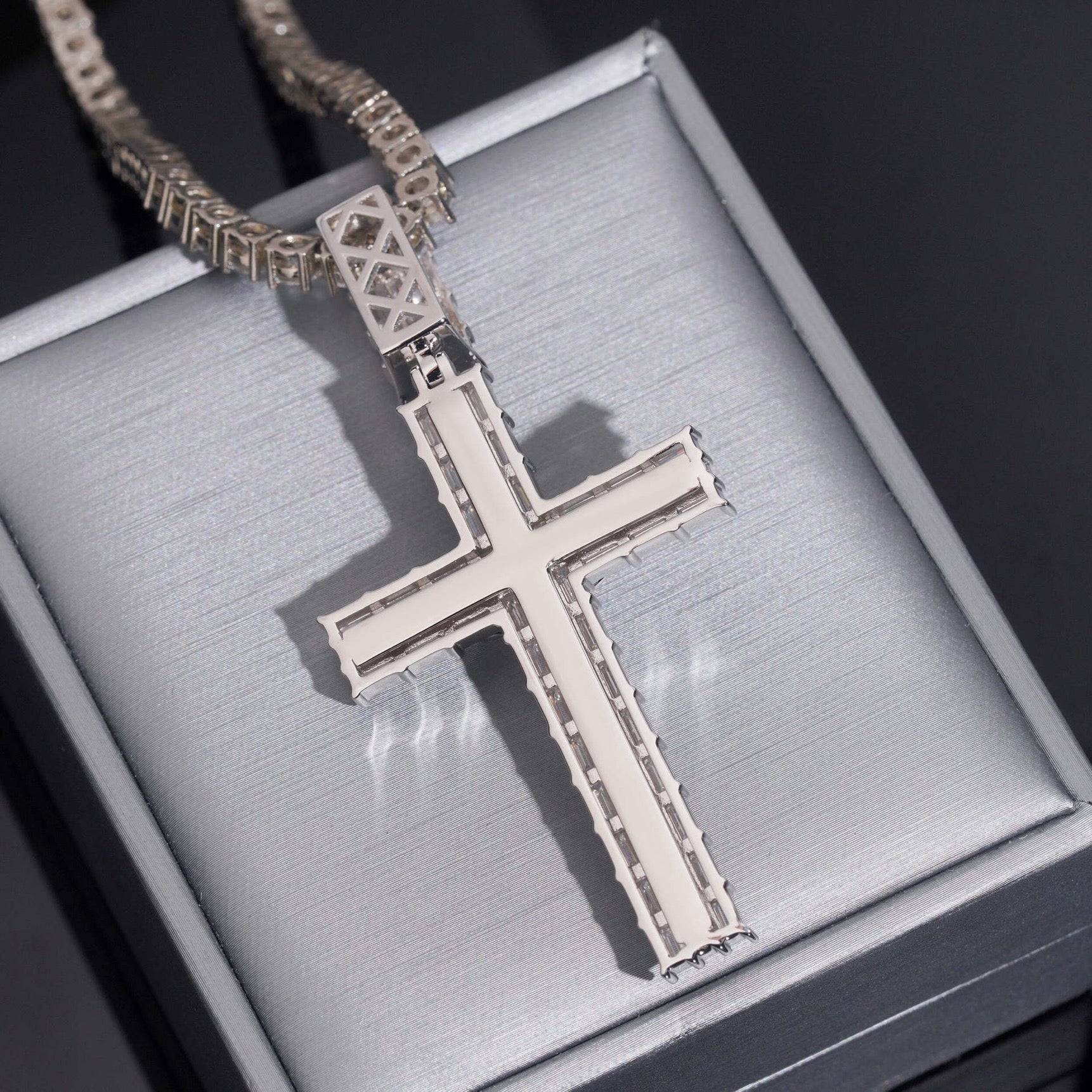 The YORI 3” Baguette Pavé Crucifix Cross Pendant is crafted from solid 925 sterling silver and fully pavé set with baguette-cut VVS D-colour moissanite stones. Each stone is precision-set to ensure secure placement, uniform coverage, and consistent brilliance across the entire pendant. Finished with white gold plating.