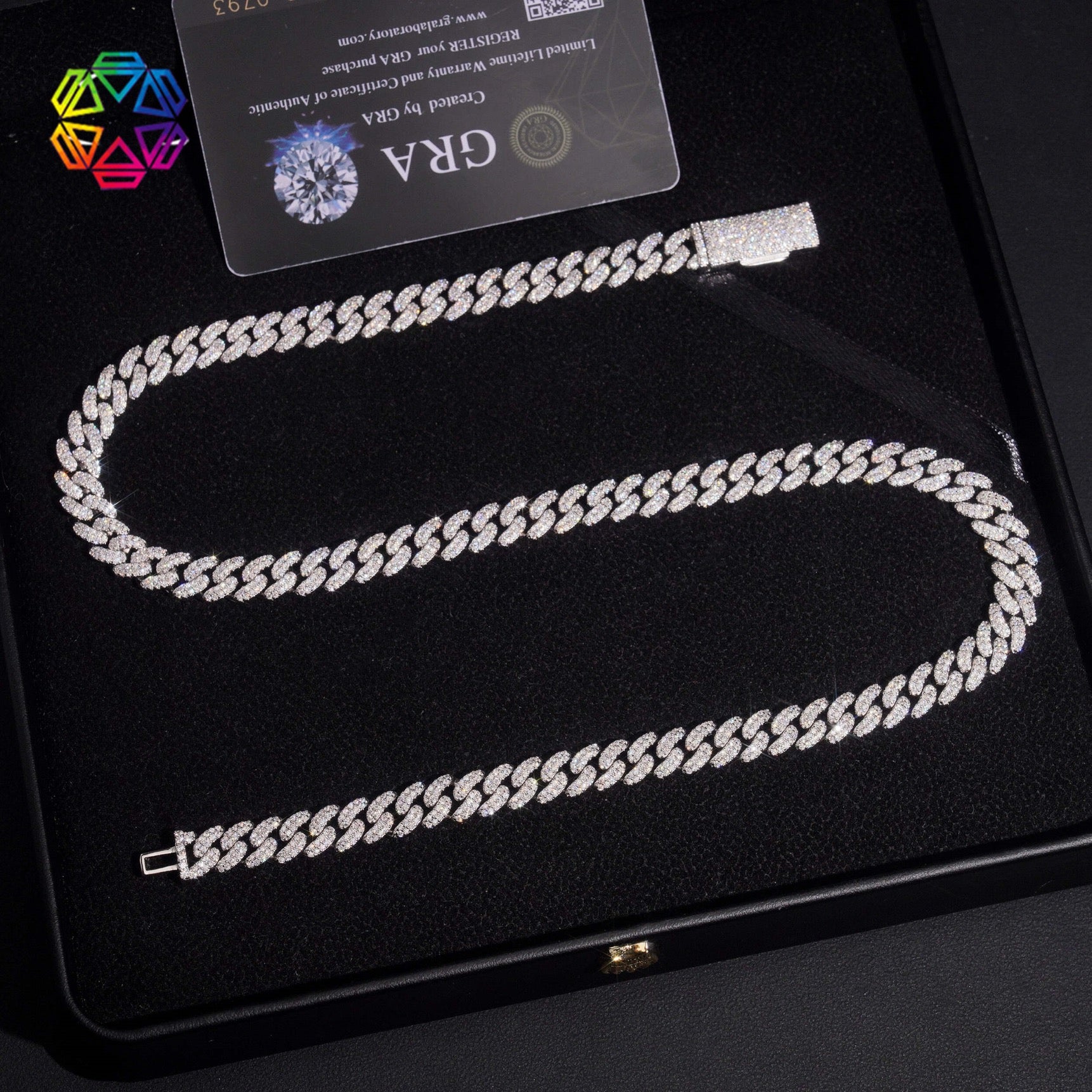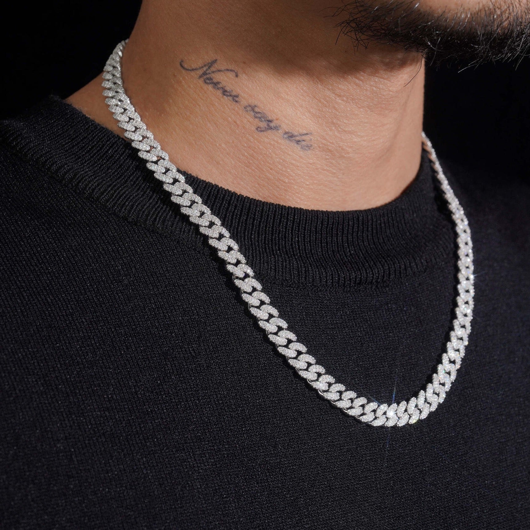 The YORI 8mm Pavé Miami Cuban Link Chain is crafted from solid 925 sterling silver and set with round, excellent-cut VVS D-colour moissanite stones. Each stone is hand-set to ensure secure placement, consistent coverage, and a clean, uniform finish across every link. Finished with a white gold plating and completed with a durable box clasp designed for long-term wear.